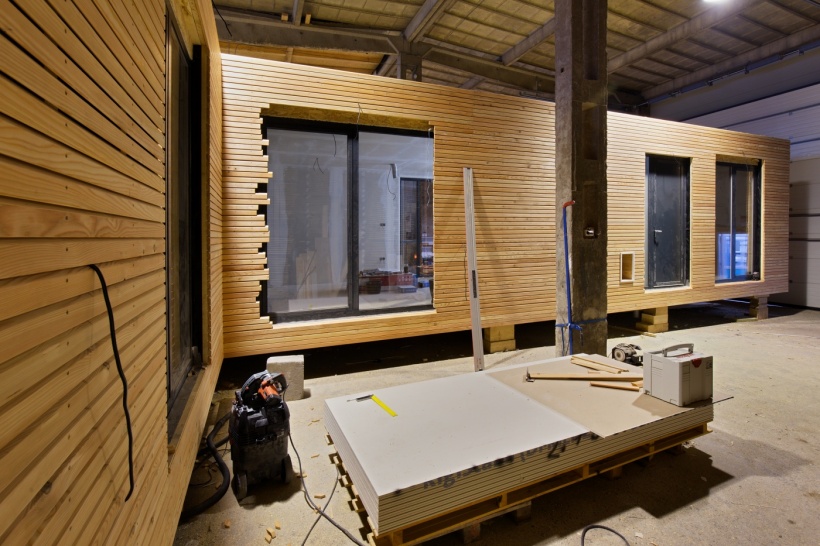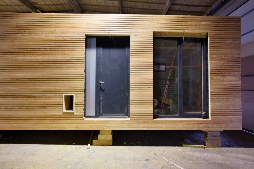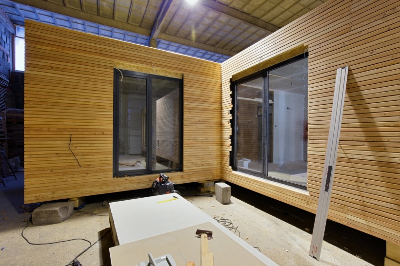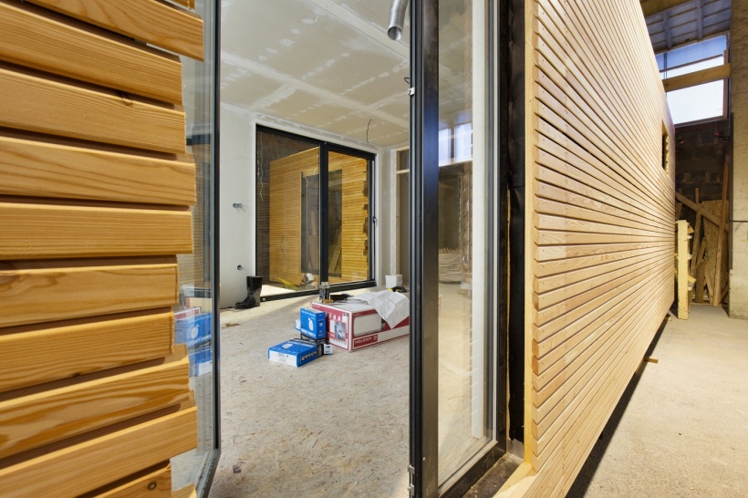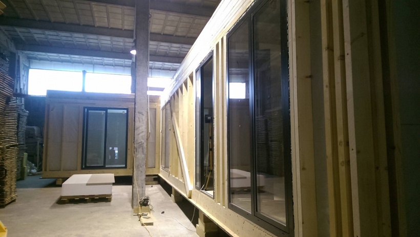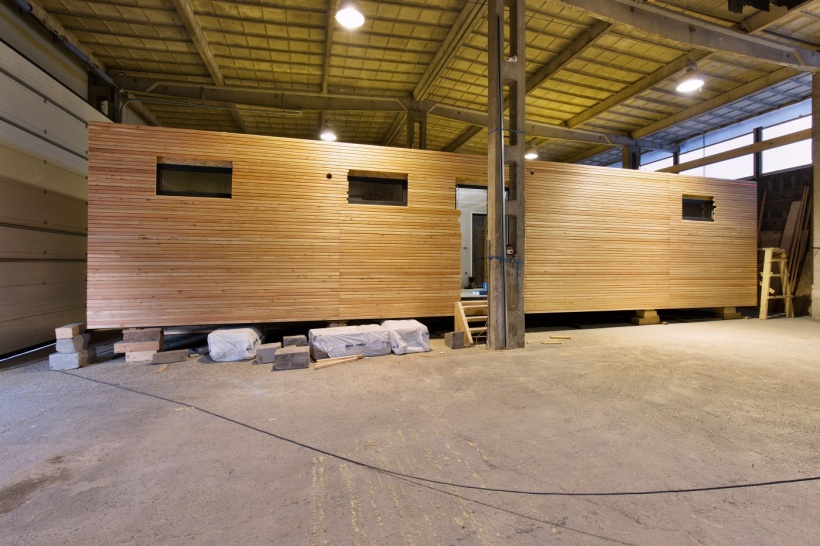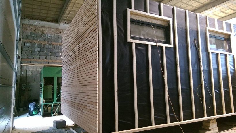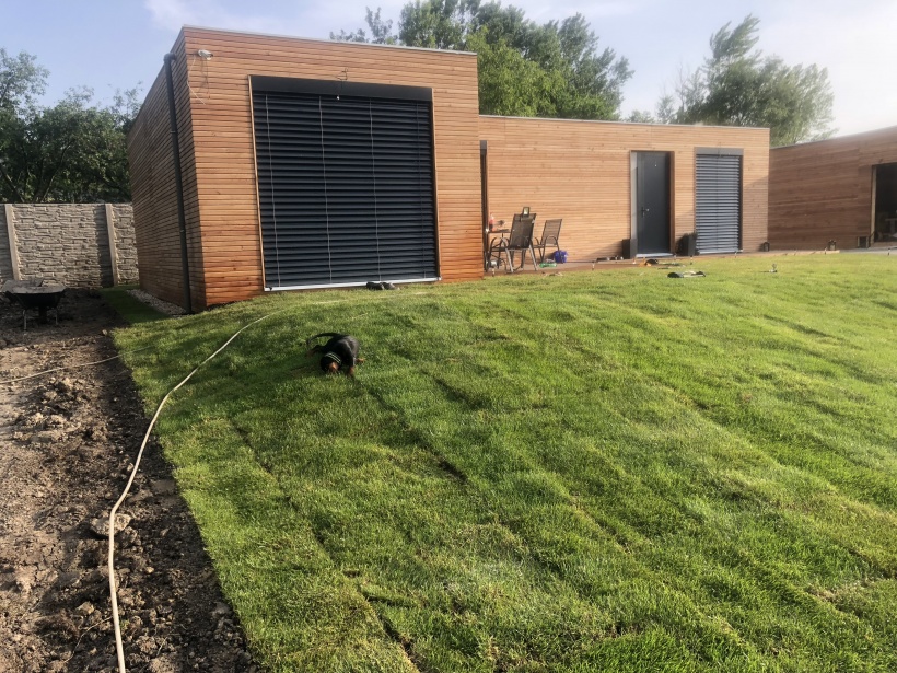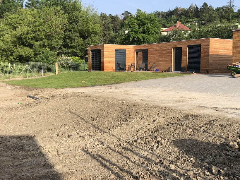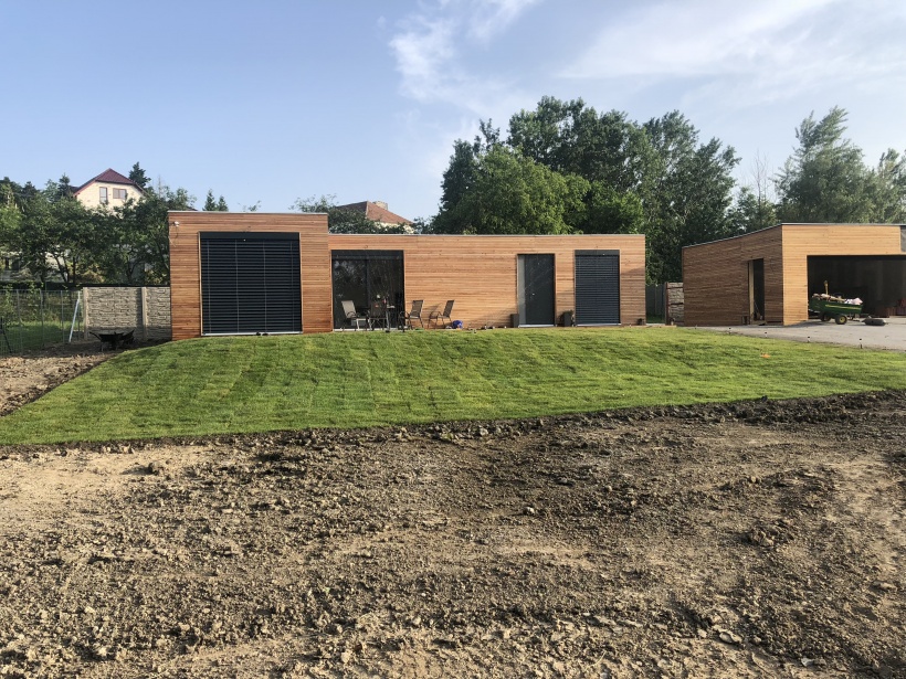 Modulárna výstavba Design 15+ do tvaru L veľkosti 15 x 4,2 metra a prístavba 3,8 x 4,2 metra. Tieto 2 časti domu boli prepojené na mieste pokládky. Dom je doplnený o klimatizáciu, podlahové vykurovanie pomocou uhlíkových fólií a vonkajšie predokenné žalúzie. Vnútorná časť L je doplnená o terasu. Celá kompozícia je obložená pomocou smrekovcového rhombusu a doplnená veľkými francúzskymi oknami. Videá z pokládok našich domov môžete nájsť na našom Youtube channelu Hutchhouse.