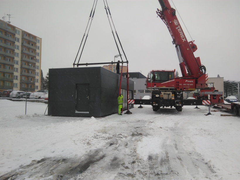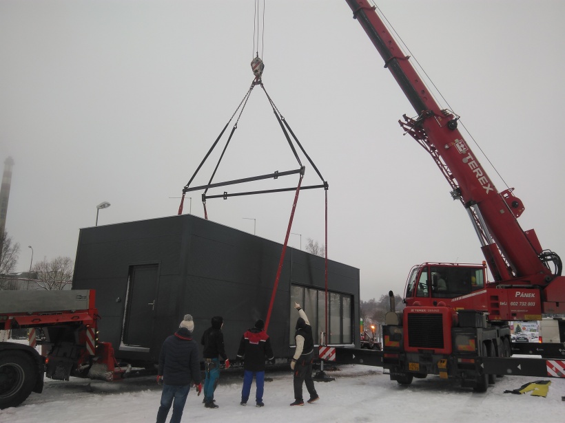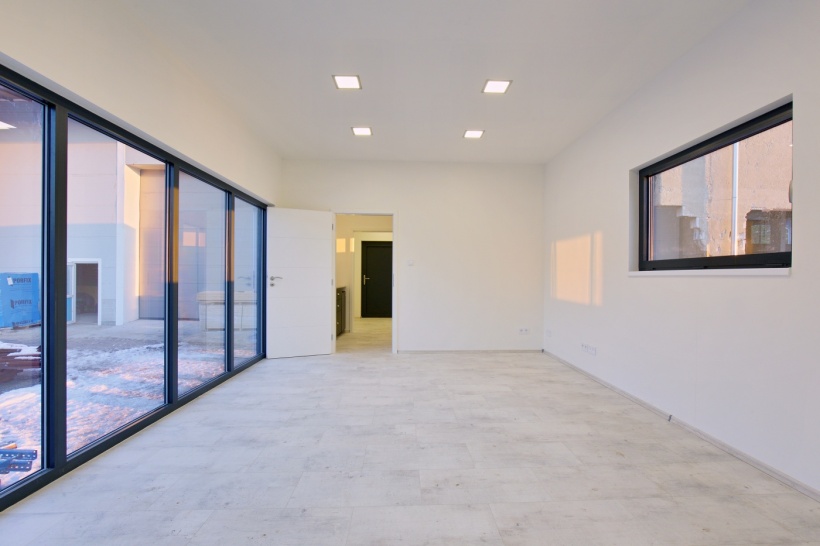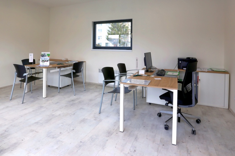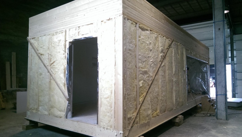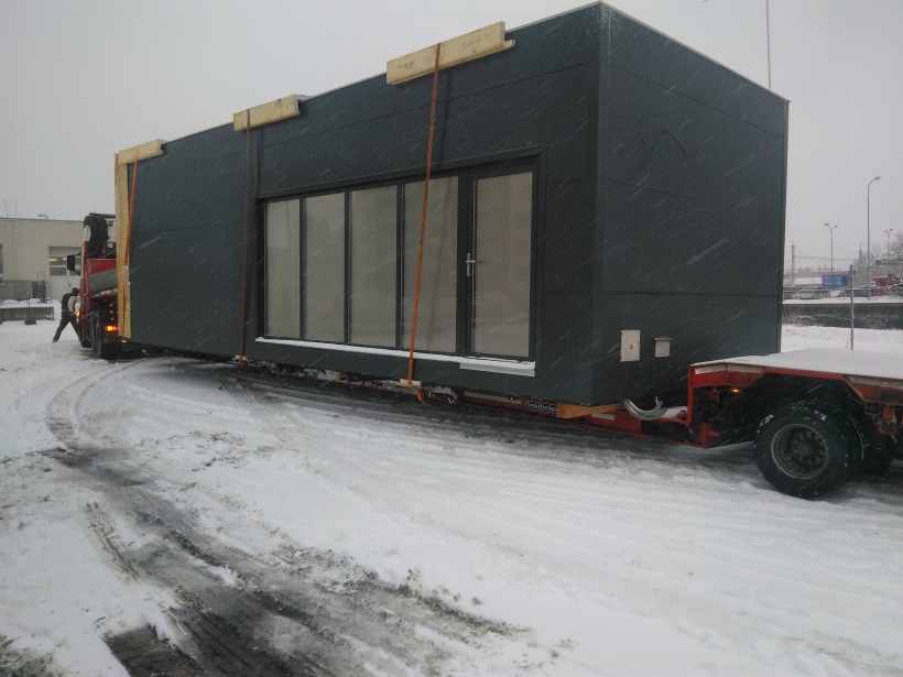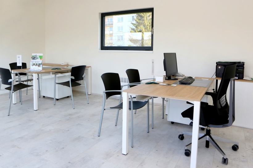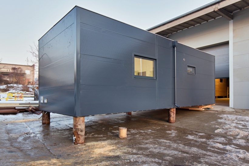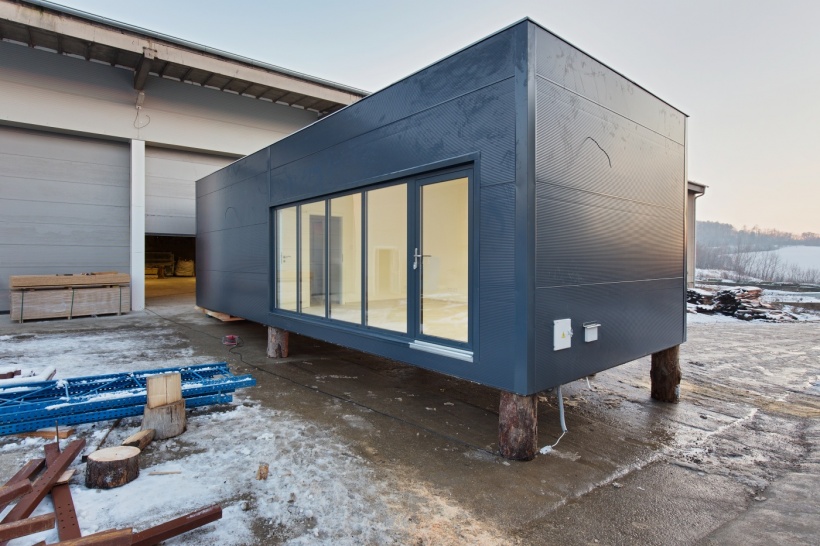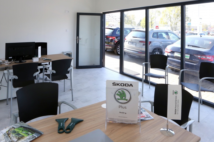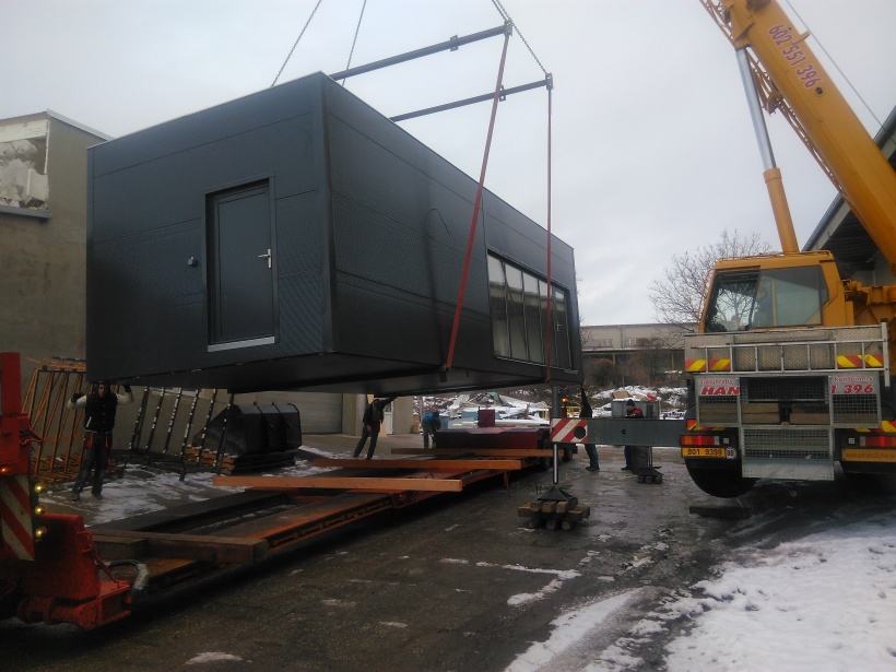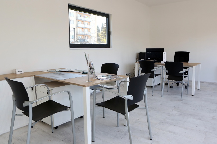 Interiér modulovej kancelárie pre ŠKODA Plus. Vnútorné dispozície sú riešené na prianie zákazníka. Videá z pokládok našich domov môžete nájsť na našom Youtube channelu Hutchhouse.